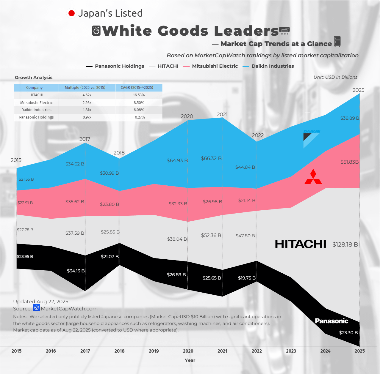 We selected only publicly listed Japanese companies (Market Cap>USD $10 Billion) with significant operations in the white goods sector (large household appliances such as refrigerators, washing machines, and air conditioners). Market cap data as of Aug 22, 2025 (converted to USD where appropriate).