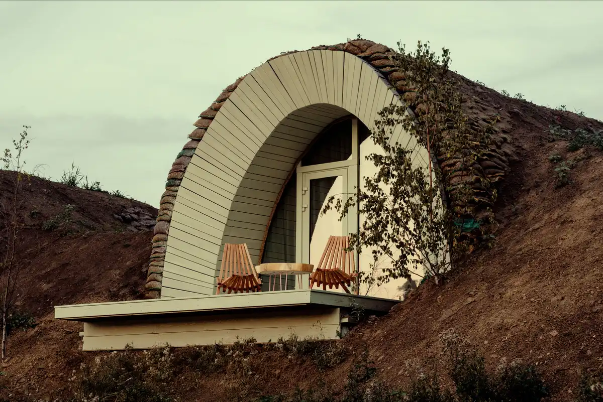 The cabins draw inspiration from the mythic image of hobbit dwellings. Each structure is partly buried in the ground and topped with a green roof, so that the forms read as gentle landforms rather than conventional buildings. This earth-sheltering approach improves thermal stability, reduces energy loss and visually restores the terrain. Domed profiles strengthen the sense of protection, while panoramic glazing opens each cabin towards the water.