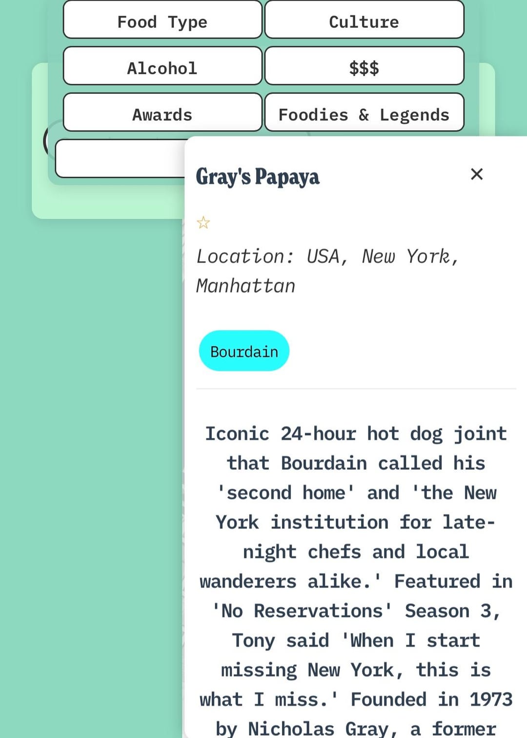• make sure you select Foodies/Legends then Bourdain… the cities aren’t just Bourdain and I don’t have all cities set up yet.