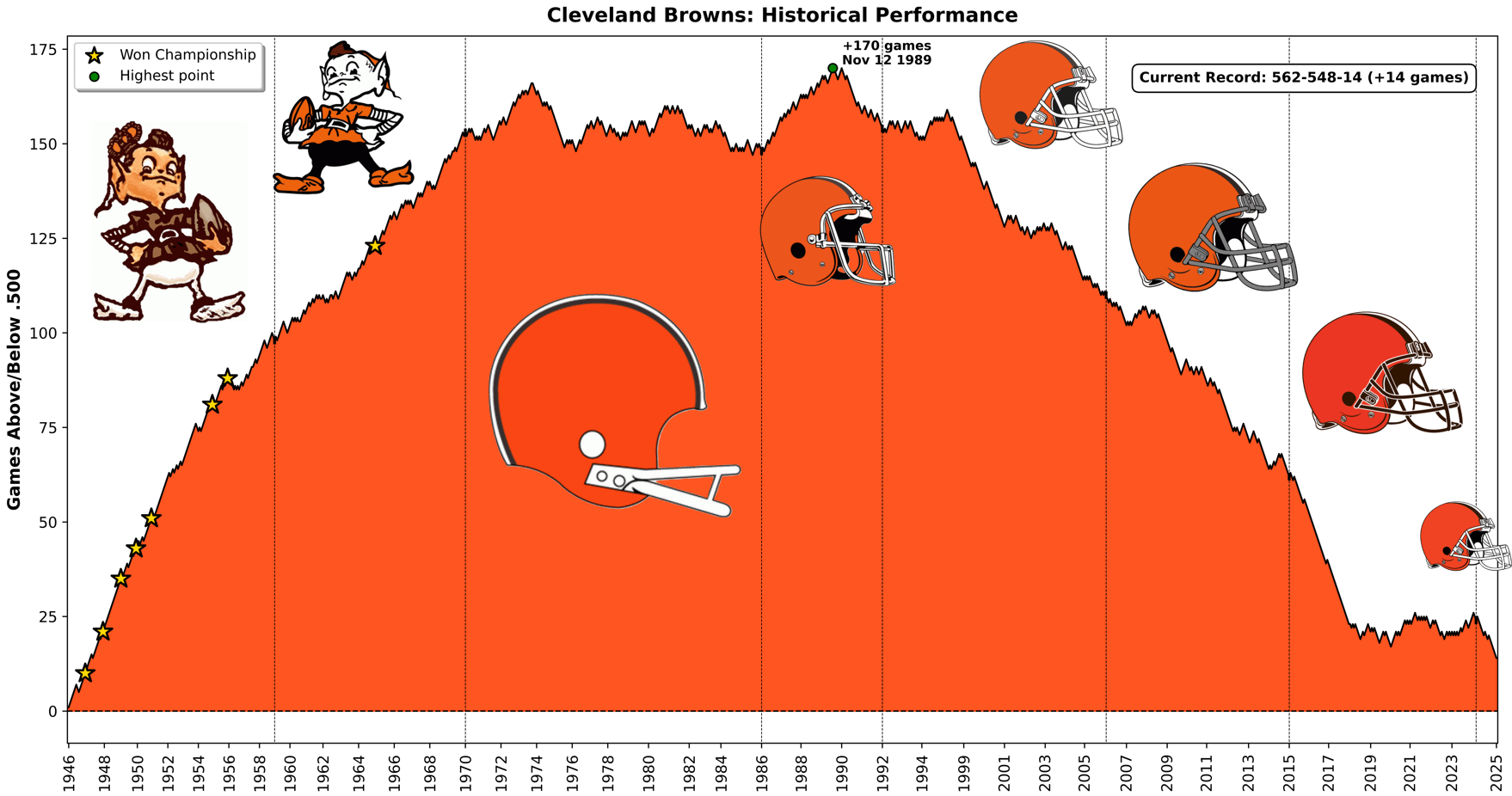 I used game data to visualize the historical performance of each NFL franchise using cumulative games above/below .500. The Cleveland Browns' chart is one of the most interesting. You can find all the charts here on Imgur.