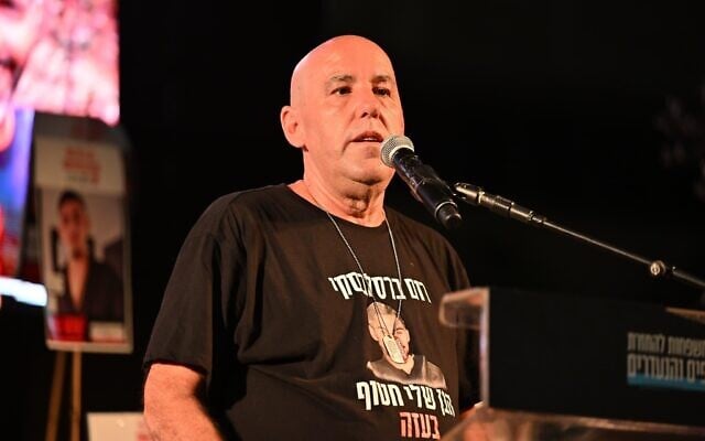 Ofir Braslavski, the father of Hamas hostage Rom Braslavski, speaks to a mass rally in Tel Aviv’s Hostages Square on August 26, 2025. (Paulina Patimer/Hostages and Missing Families Forum)