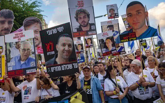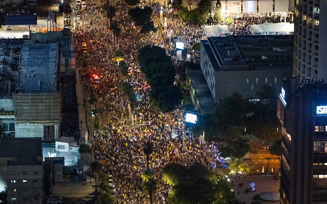 The day’s protests, which saw the blocking of several major highways, marches to the homes of ministers, and protests outside the Prime Minister’s Office as he held a security cabinet meeting there, culminated in a major protest in Tel Aviv’s Hostage Square, which drew some 350,000 people, according to organizers.
