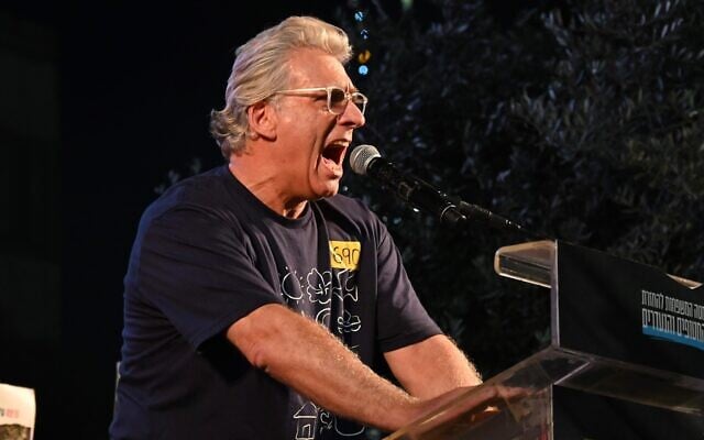 Actor Lior Ashkenazi delivers the opening speech at a thousands-strong rally demanding a hostage-release and ceasefire deal in Tel Aviv’s Hostages Square on August 26, 2025. (Uriel Even Sapir/Hostages and Missing Families Forum)