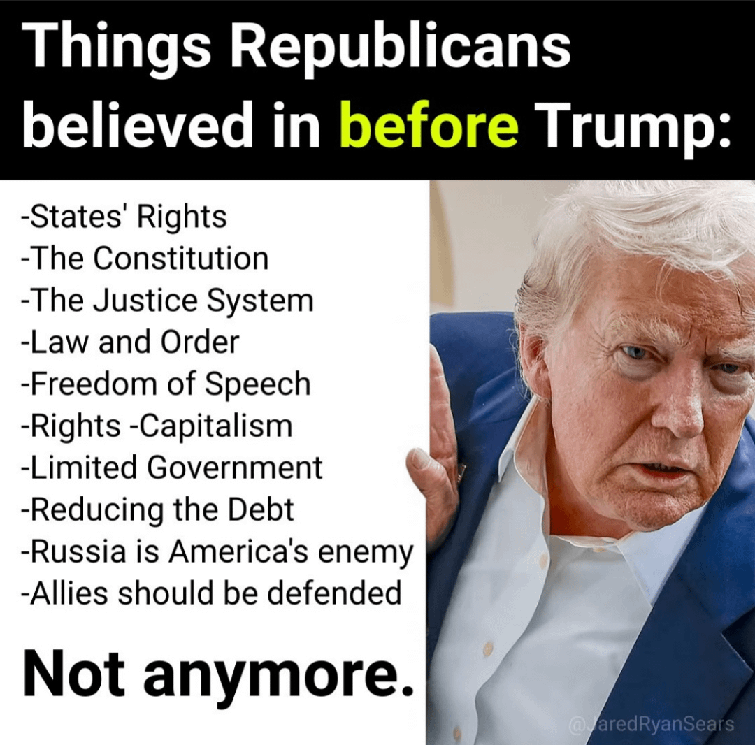 They never believed in any of those things except maybe “beating Russia,” but that’s more because of their violence and military fetish than any understanding of why a brutal dictatorship is horrible. As for the rest, it’s all lies they spew to lure in stupid voters or a cover for something else, such as “state’s rights.” A state’s right to do what? Oh, own people of course! And control women, beat down people they don’t like, make everyone poor, etc. Republicans, like conservatives of all stripes, have always been hateful authoritarian liars and cowards who will say anything to bring about tyranny.