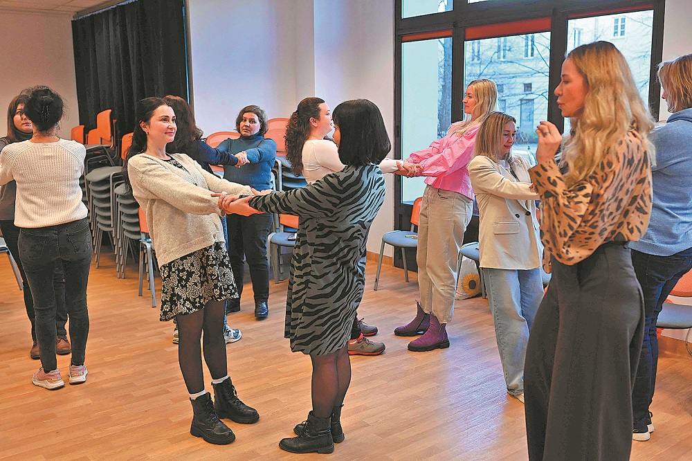 A psychotherapist conducts a training session for Ukrainian refugees at the Ukrainian Women”s Club in Warsaw, Poland, on Jan 30. SERGEI GAPON/AFP