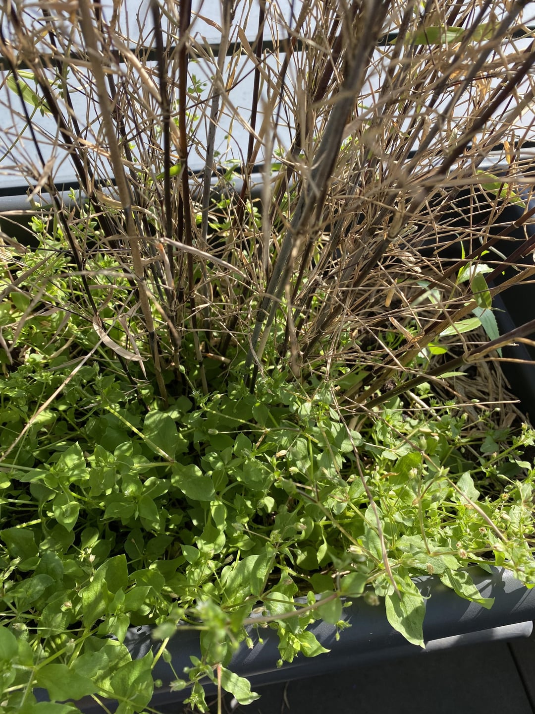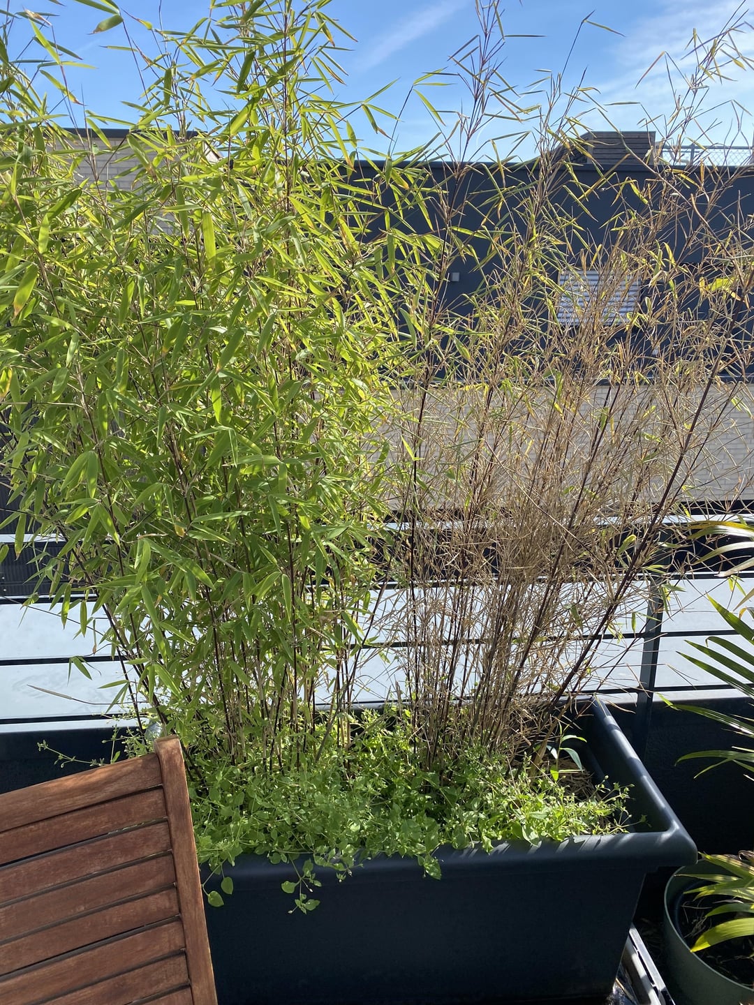 Ich habe hier zwei Bambus in einem Kübel, der linke floriert wunderbar, aber der rechte stirbt/vertrocknet, was muss ich anders machen? Liegt das vllt an dem Unkraut mit im Kasten?