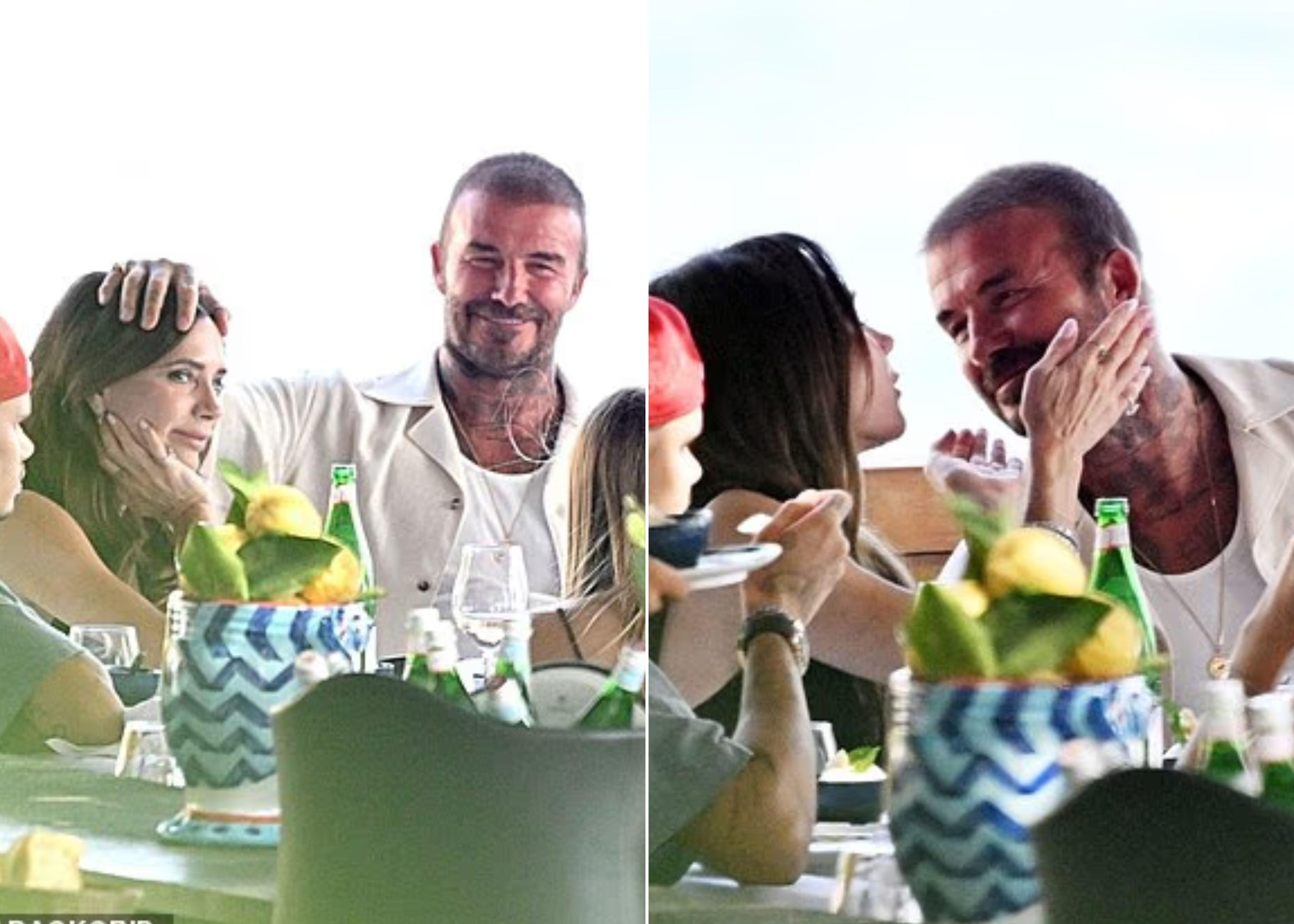 The setting was their favourite lemon-decked restaurant in Nerano, Lo Scoglio. And there was 50-year-old David, stroking Victoria’s face like it was a Dolce & Gabbana ad, then going for their first ever proper public, no-holds-barred (eyes closed, head tilted back) smooch over the linguine.