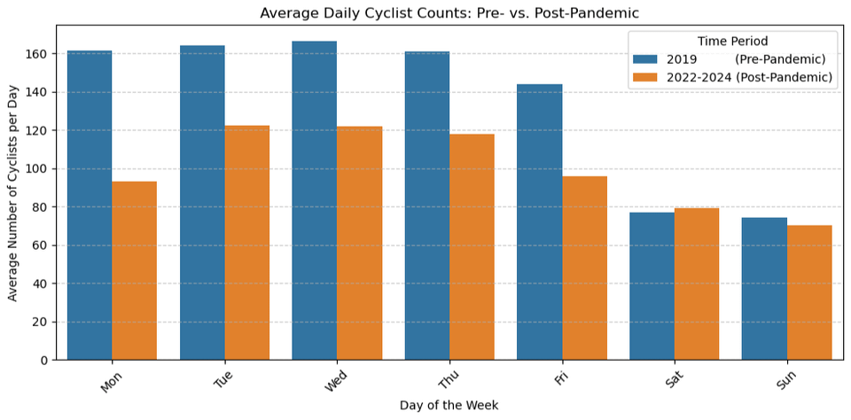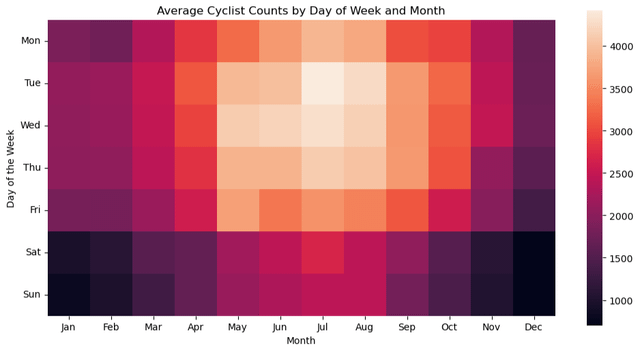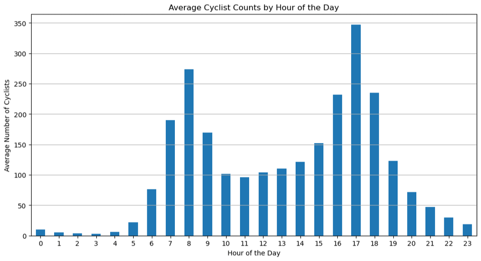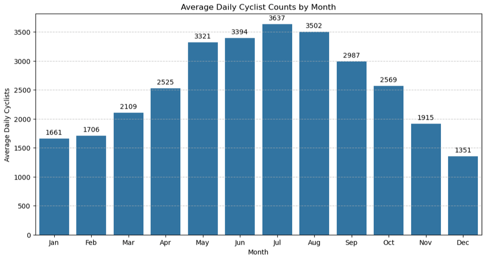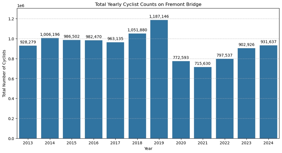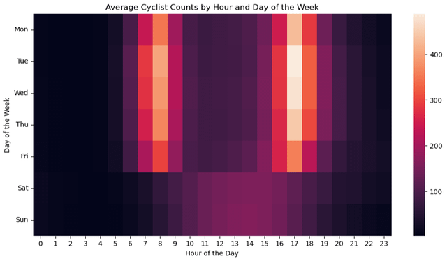 1. Hi everyone, OP here! I’ve been an avid cyclist since age four and have recently stumbled upon open access bike counter data, so I decided to visualize it. I used Python (Pandas, Matplotlib, Seaborn) to clean the data and create the charts. Data source: [https://www.seattle.gov/transportation/projects-and-programs/programs/bike-program/bike-counters/fremont-bike-counters](https://www.seattle.gov/transportation/projects-and-programs/programs/bike-program/bike-counters/fremont-bike-counters)