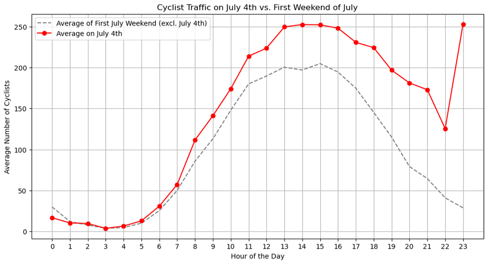 • Finally, a fun dive into a couple of holidays to see if we can spot cyclists heading to New Year's and July 4th fireworks!