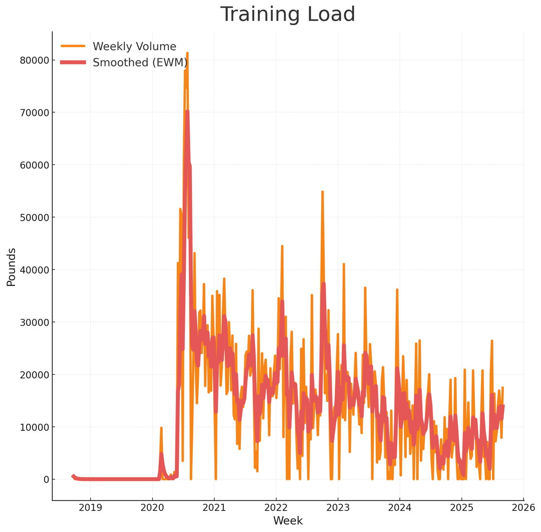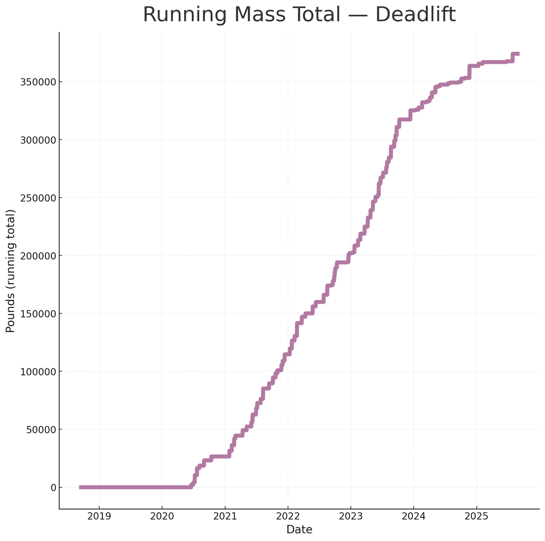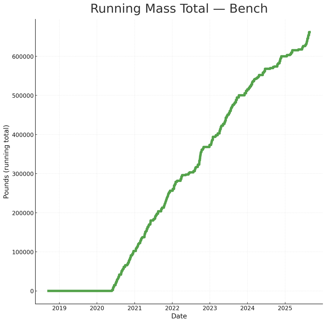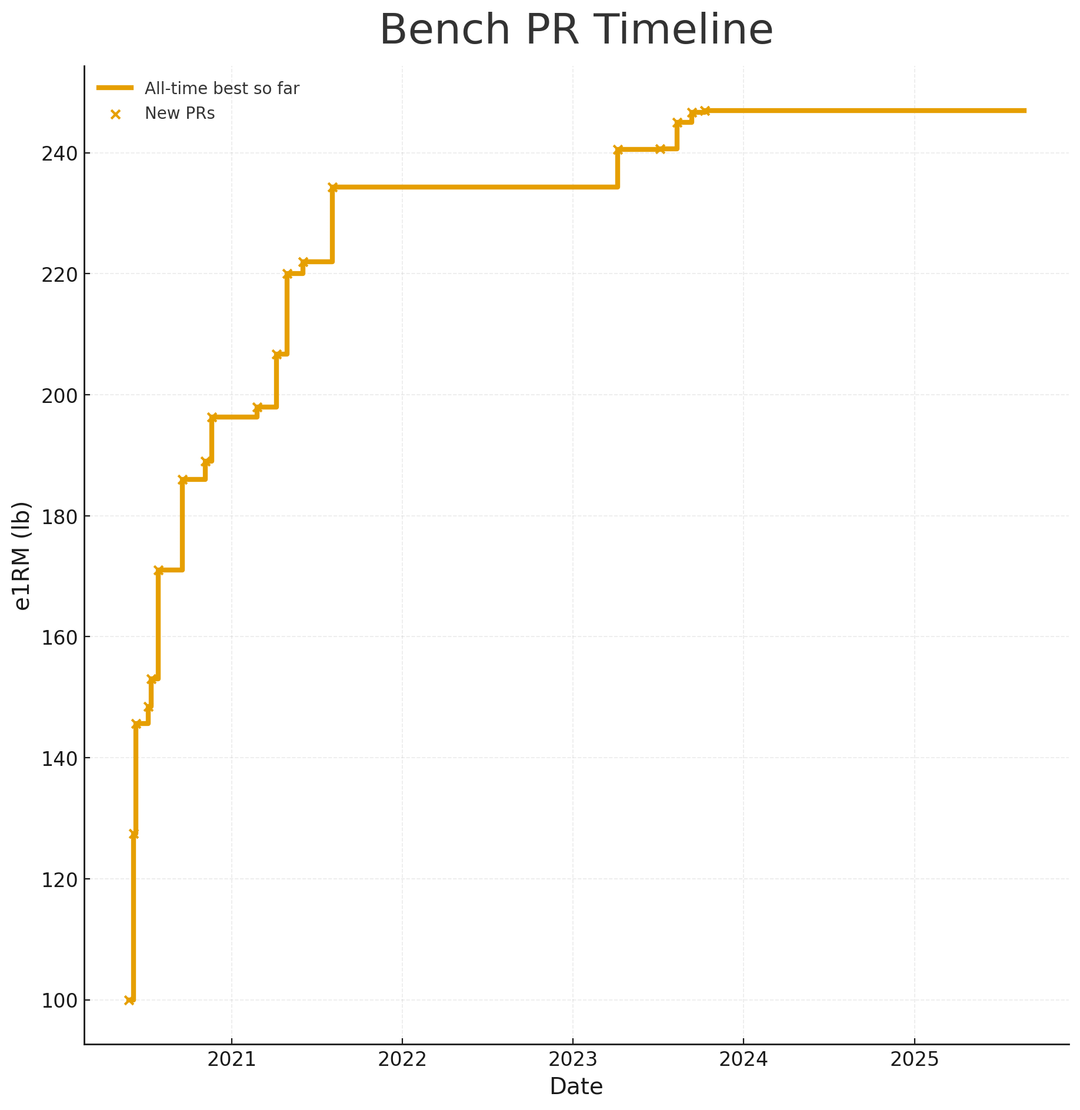 I was super into working out back then, but life is life, so I have been too busy to give it the energy I once had. Recently, I became single again and found more time. Also, I got more serious about my medical conditions (hEDS and a heart valve problem) so I pivoted away from deadlifts and squats which is reflected in the data. This pivot created more time for bench which is also reflected with a sharp upwards tick recently.