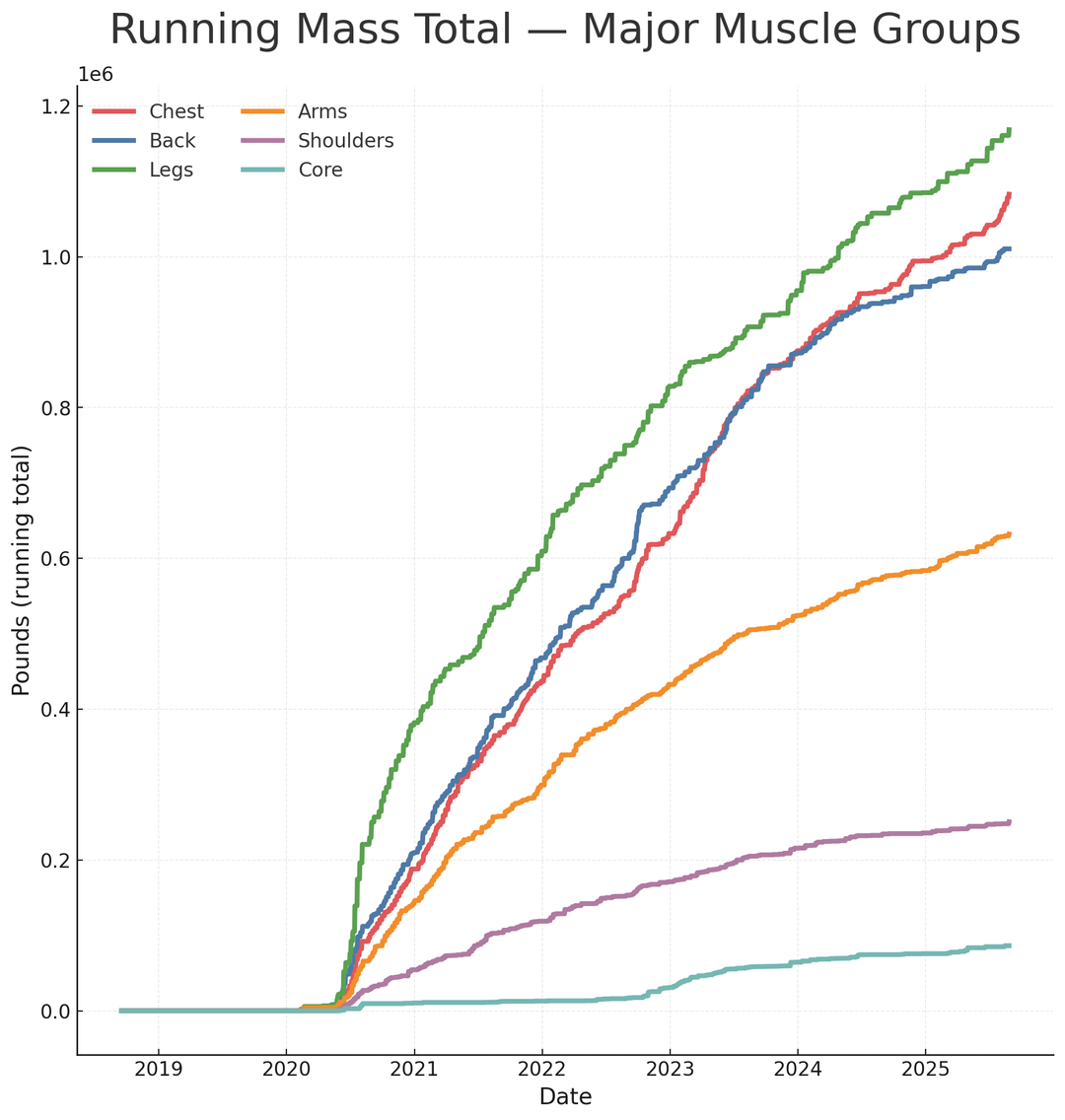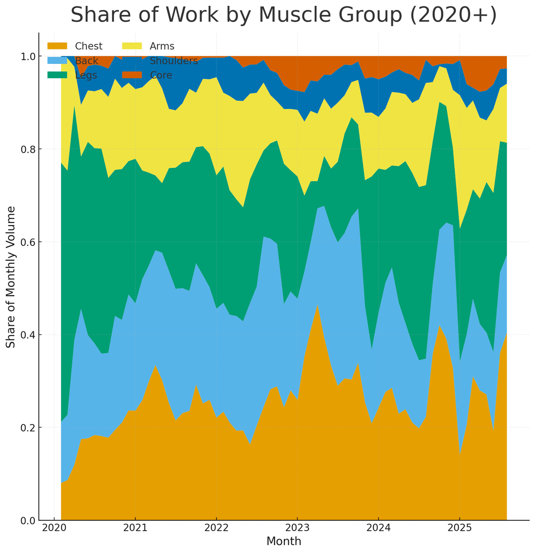 1. Without normalizing by the number of times you worked out a muscle group, it’s hard to draw conclusions