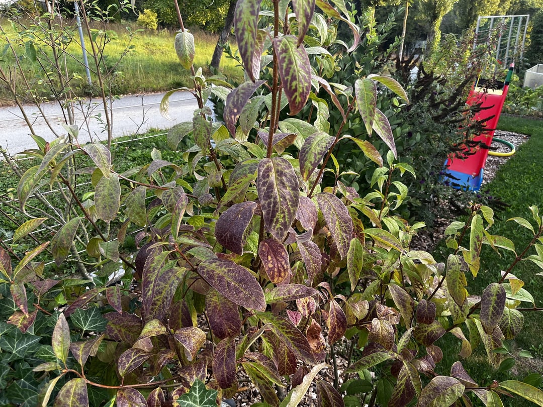 Die roten Blätter auf Bild 5 könnten auf Sonnenbrand deuten, bin mir aber nicht sicher. Einige Pflanzen produzieren einen eigenes Sonnenschutzmittel, dadurch färben sich die Blätter rot