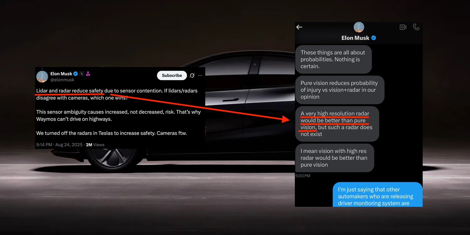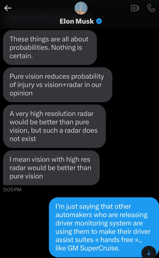 As he admitted in the DMs with me in 2021, Musk is aware of this â hence why he acknowledged that high-resolution radar combined with vision would be safer than vision alone.