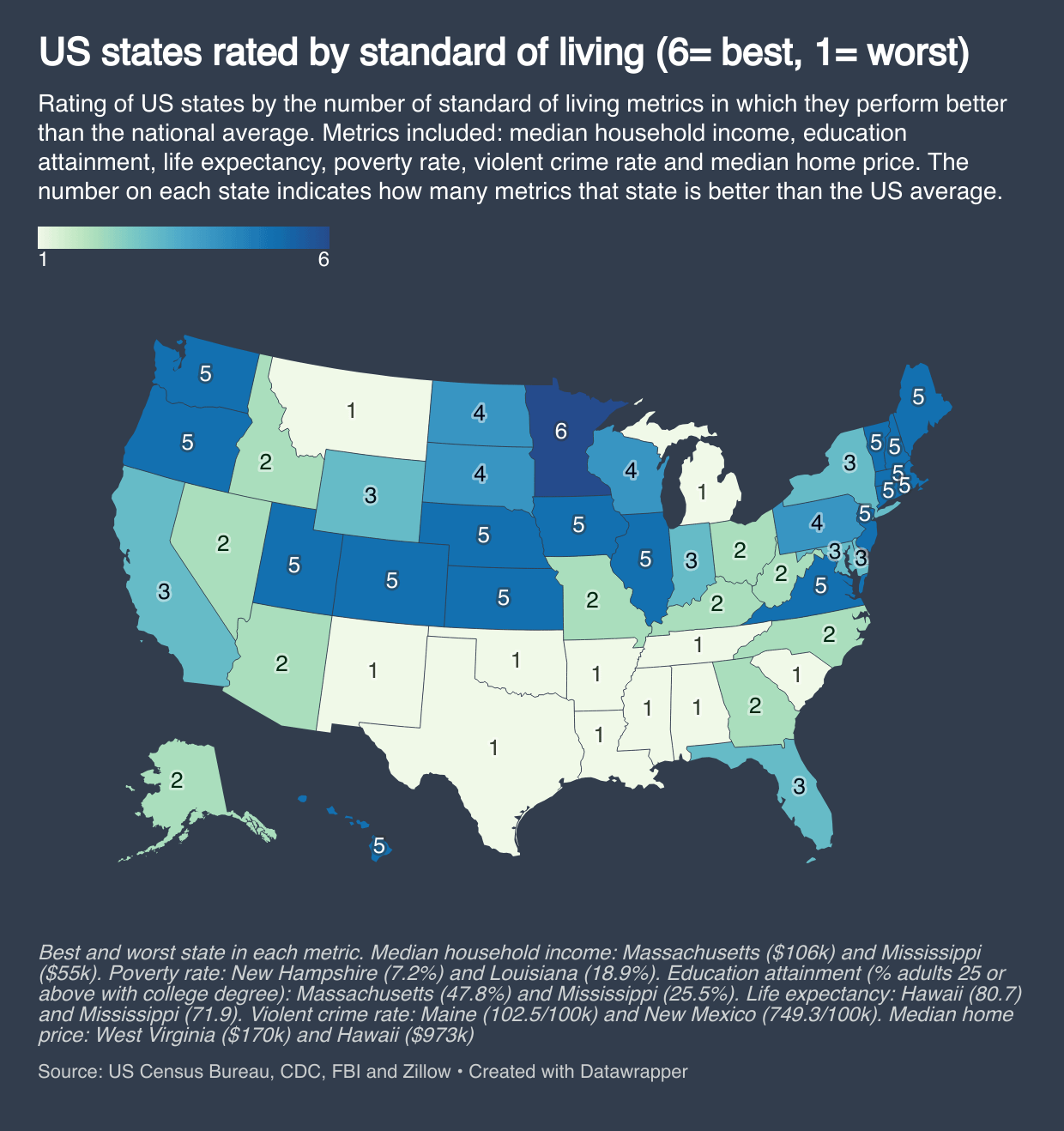 1. Sources: [Median household income](https://fred.stlouisfed.org/release/tables?rid=249&eid=259515#snid=259516), [Education attainment ](https://fred.stlouisfed.org/release/tables?eid=391444&rid=330), [Life expectancy ](https://www.cdc.gov/nchs/data-visualization/state-life-expectancy/index_2021.htm), [Poverty rate ](https://www2.census.gov/library/publications/2024/demo/acsbr-022.pdf), [Violent crime rate ](https://cde.ucr.cjis.gov/LATEST/webapp/#/pages/downloads) and