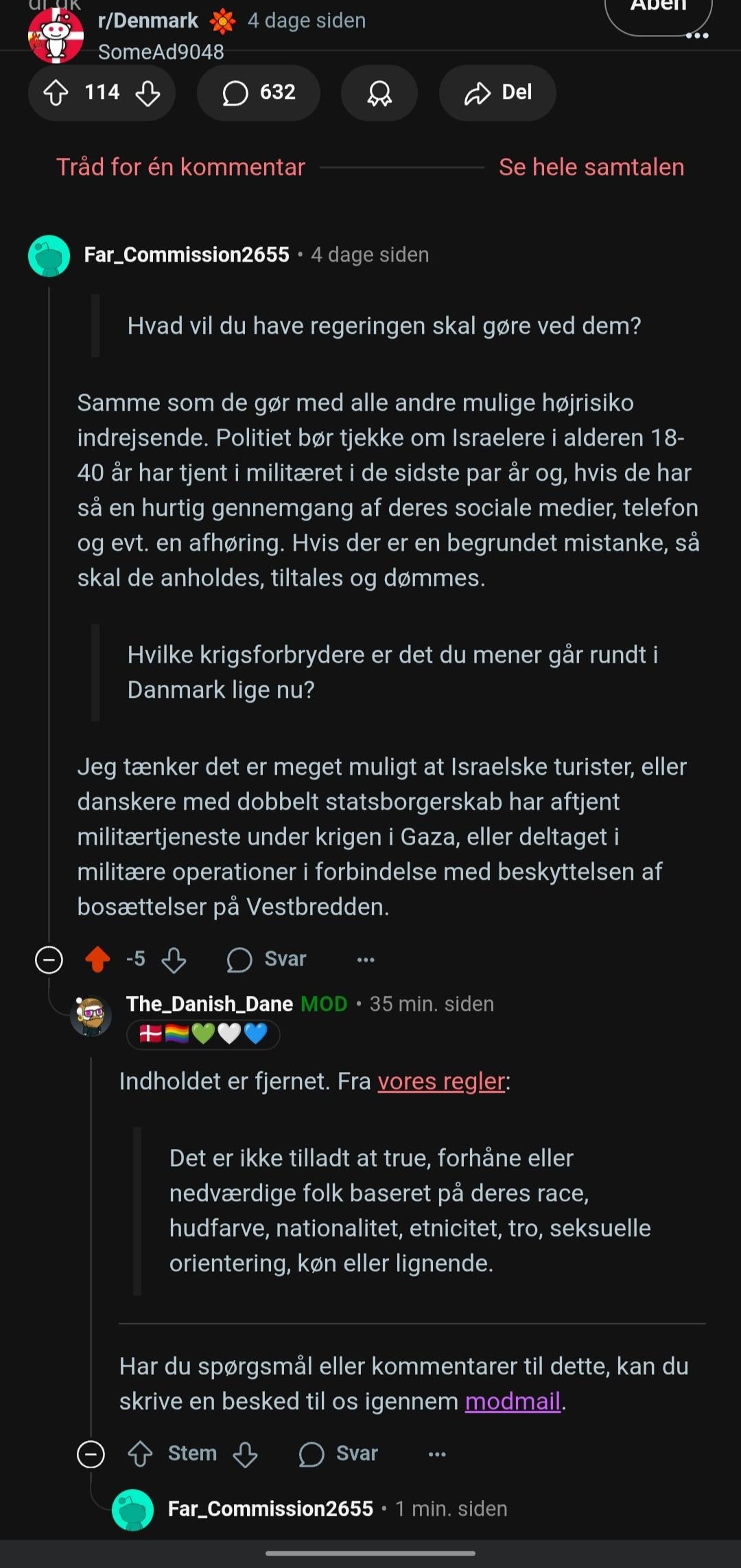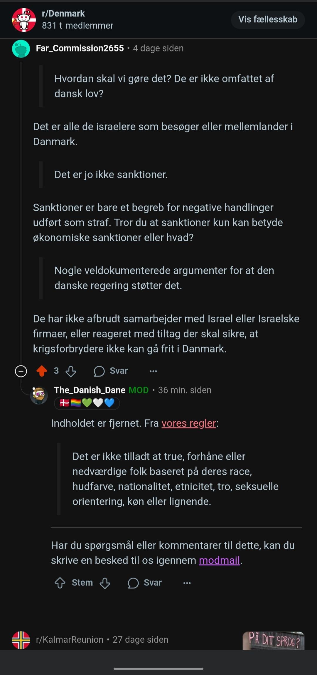 Jeg mener generelt at moderationen på r/Denmark er for skrap, hellere lade lidt for meget være end at fjerne et indlæg der ikke skulle fjernes.