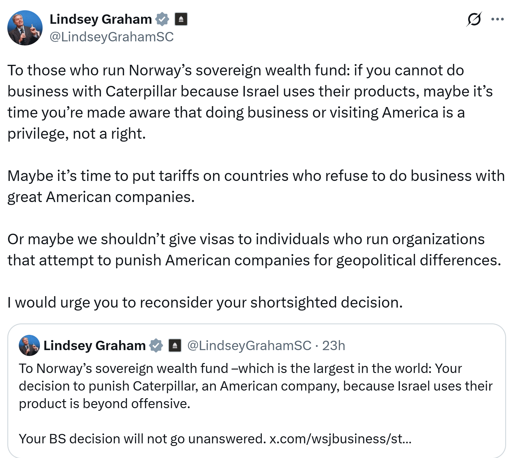 This is like.. not even in the top 10 of the most unhinged Lindsey Graham statements this week. From starting multiple new wars, encouraging nuclear first strikes, the dissolvement of any international agreements, to specific comments about energy policy in multiple countries.
