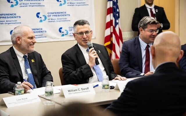 Foreign Minister Gideon Saâar speaks at the Conference of Presidents of Major American Jewish Organizations in New York, in an image released on August 26, 2025. (Ohad Kab/Foreign Ministry)