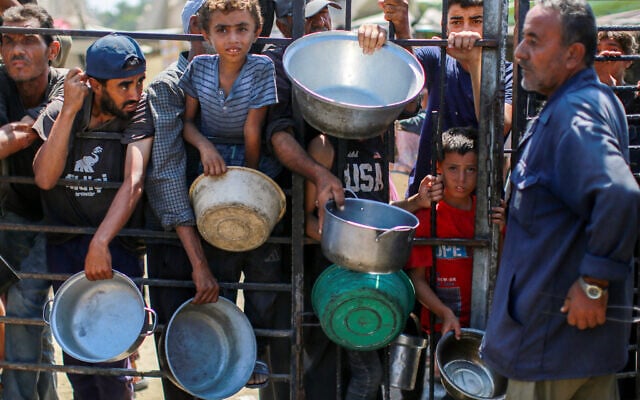 People wait for rice from a charity kitchen providing food for free in the west of Gaza City, on August 28, 2025. (Bashar Taleb / AFP)