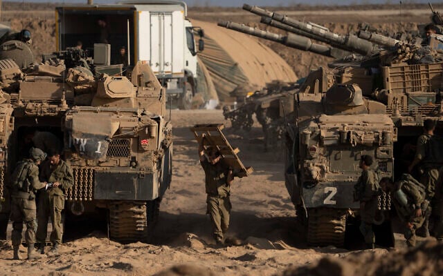 Israeli soldiers near their armored vehicles parked in a staging area near the Israeli-Gaza border, as seen from southern Israel, Tuesday, August 26, 2025. (AP/Maya Levin)