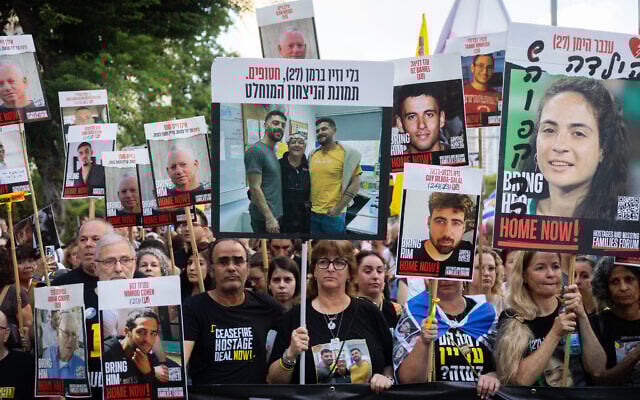 Families of hostages, living and dead, who are held in the Gaza Strip, and supporters, march in Tel Aviv calling for a deal to secure their return, August 26, 2025. (Chaim Goldberg/Flash90)