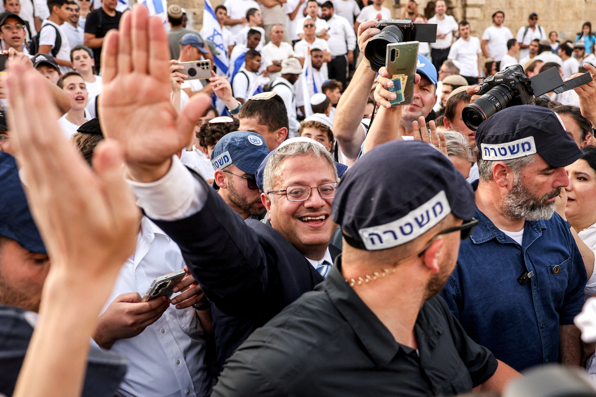 National Security Minister Itamar Ben-Gvir, surrounded by policemen, waves to right-wing activists gathering outside Damascus Gate of Jerusalem’s Old City on Jerusalem Day, May 26, 2025. (Ahmad Gharabli/AFP)