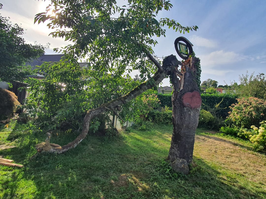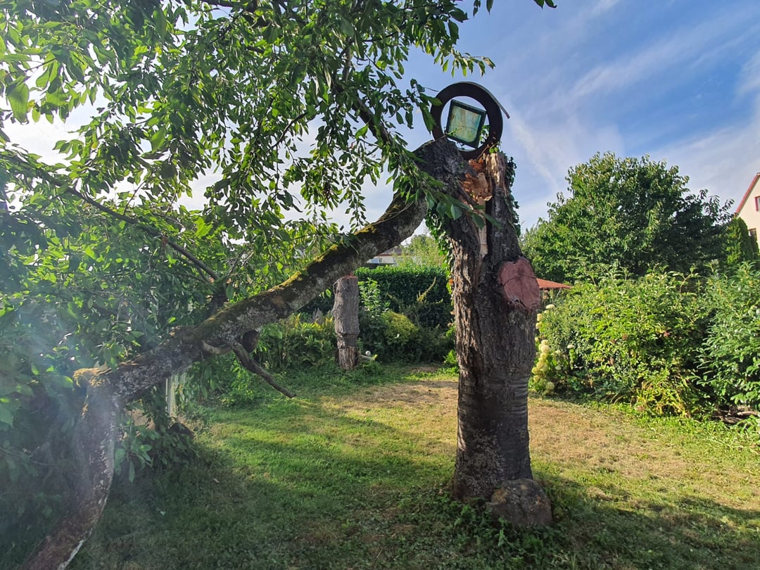 Der Vorbesitzer hat den Kirschbaum so extravagant wachsen lassen und dieses "Kunstwerk" oben drauf gesetzt.