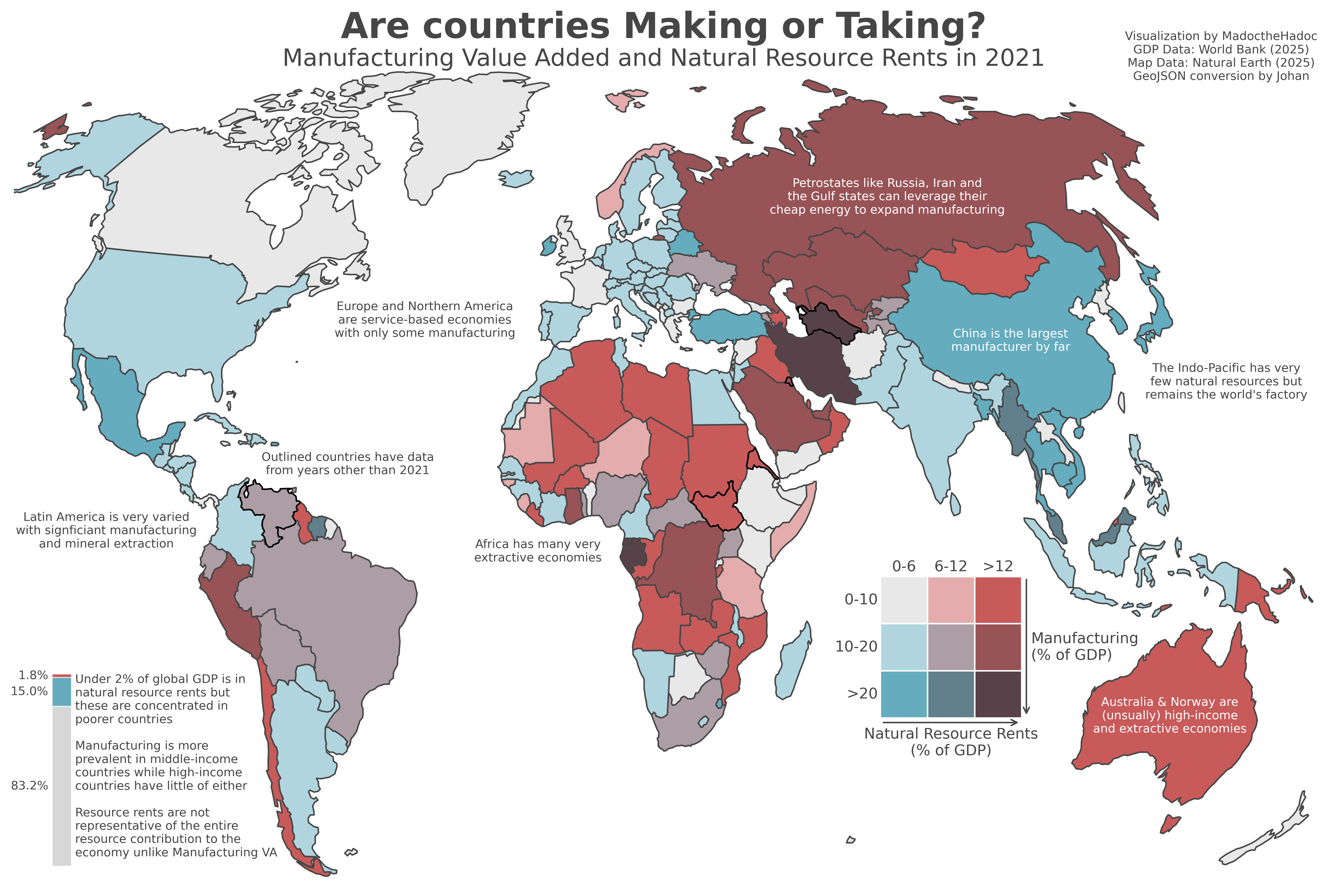 Natural resource rents just measure the profit of the resources, so (sale price – extraction cost) while value added in manufacturing is much more comprehensive and tries to calculate it as a sector of the entire economy. These are just the only available datasets I could find so keep in mind that if 6-12% of the economy comes from resource rents alone, this does not include the wages or taxes paid from the process of that resource extraction while in Manufacturing VA they are; Canada for instance makes it into the white category with 4.9% resource rents in 2021 but up to 20% of the economy could be considered "resource extraction" if we take a broader definition.