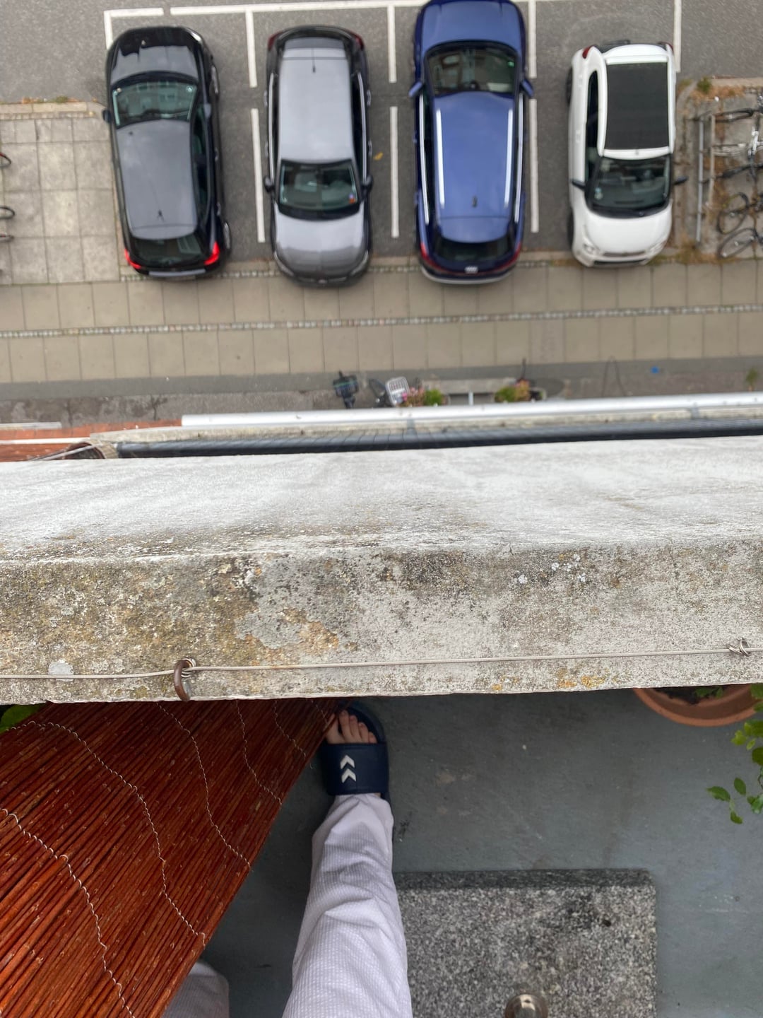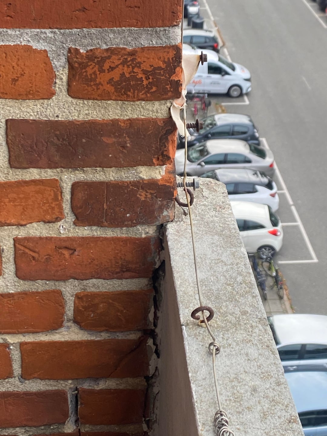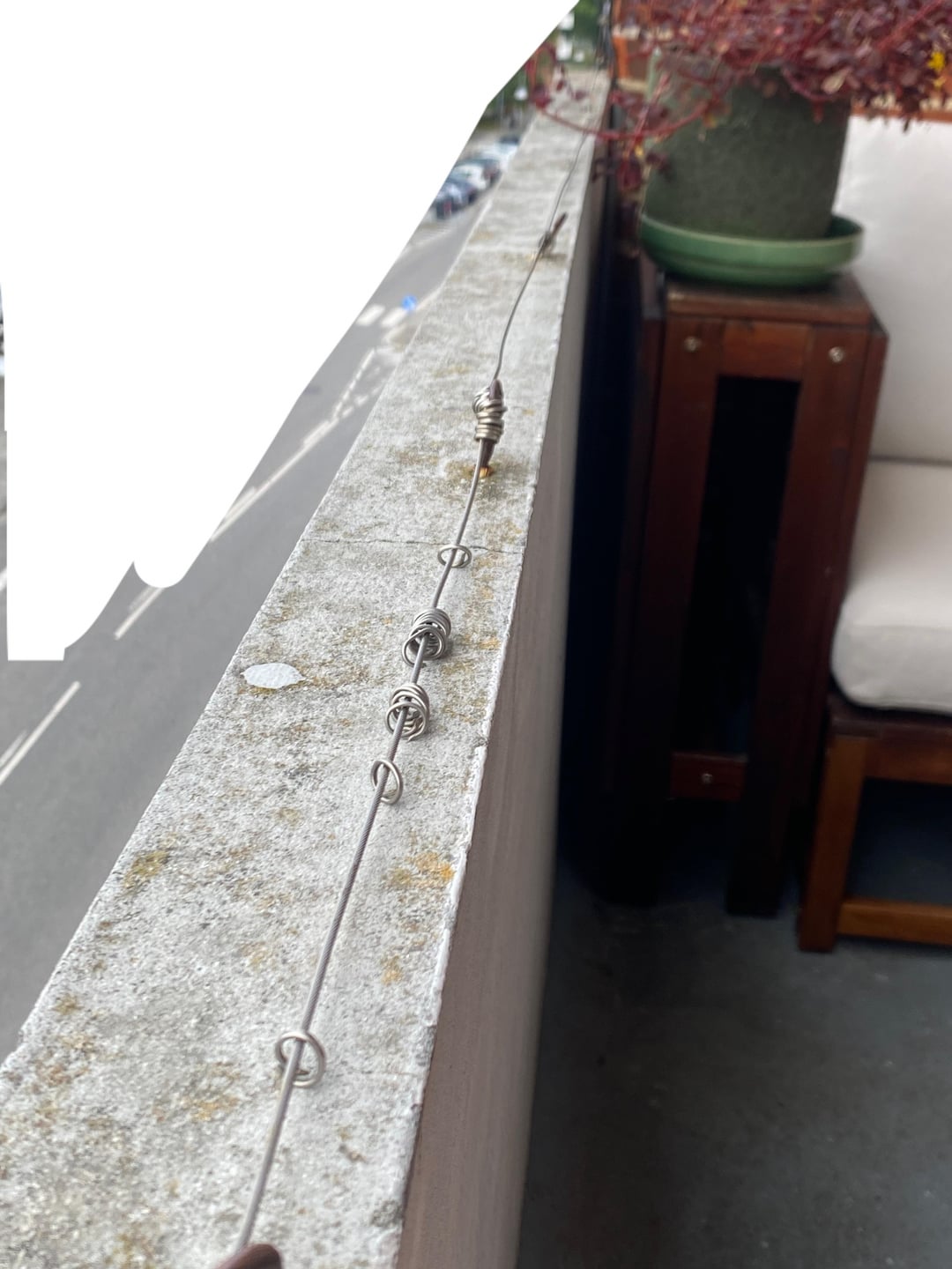 Det ser ud som om der er huller i murværket allerede? Tænker nogen før dig har haft smidt forankrings kroge i væggen og spændt metalwire ud – og så monteret sån nogle teltdugs afskærmninger til altaner…
