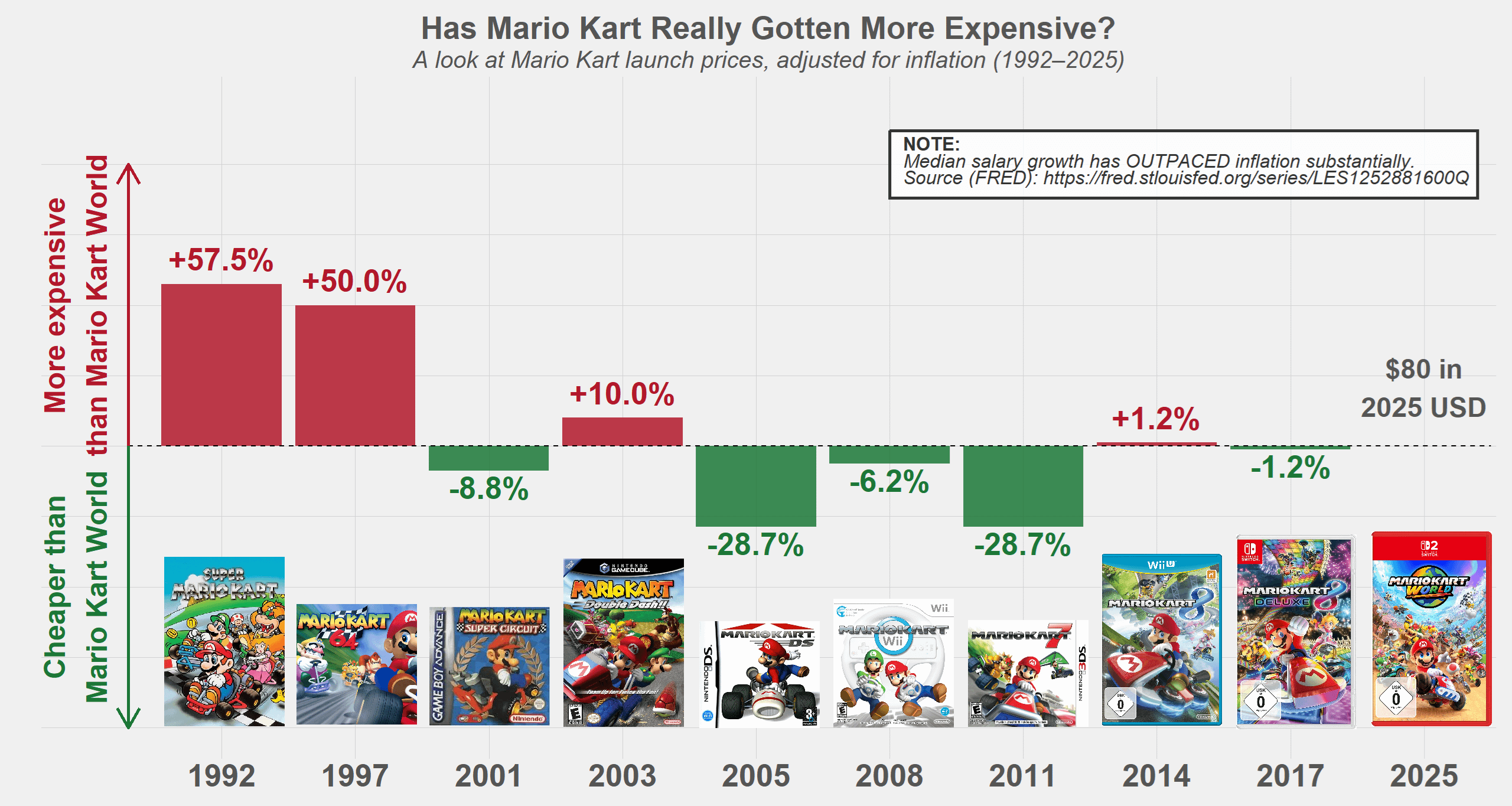 - Source: For nominal prices I used various sources. The price of recent games is easy to find on Wikipedia, older games oftentimes varied a lot in price so I resorted to finding catalog screenshots from the 90s and parsing through posts on forums from the 2000s. It may well be the case that the nominal price you paid for Mario Kart games in the 90s varies by ~10 USD one way or another. I then ran the numbers through an inflation adjustment tool with July 2025 USD as the baseline. This site was also quite useful although it most certainly underestimates the nominal price of the 90s games: https://gamerant.com/mario-kart-game-launch-price-adjusted-inflation-difference-increase/