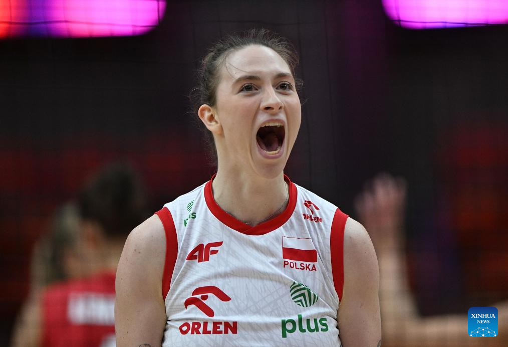 Aleksandra Gryka of Poland celebrates scoring during the round of 16 match between Poland and Belgium at the Volleyball Women’s World Championship in Bangkok, Thailand, Aug. 30, 2025. (Xinhua/Hou Zhaokang)
