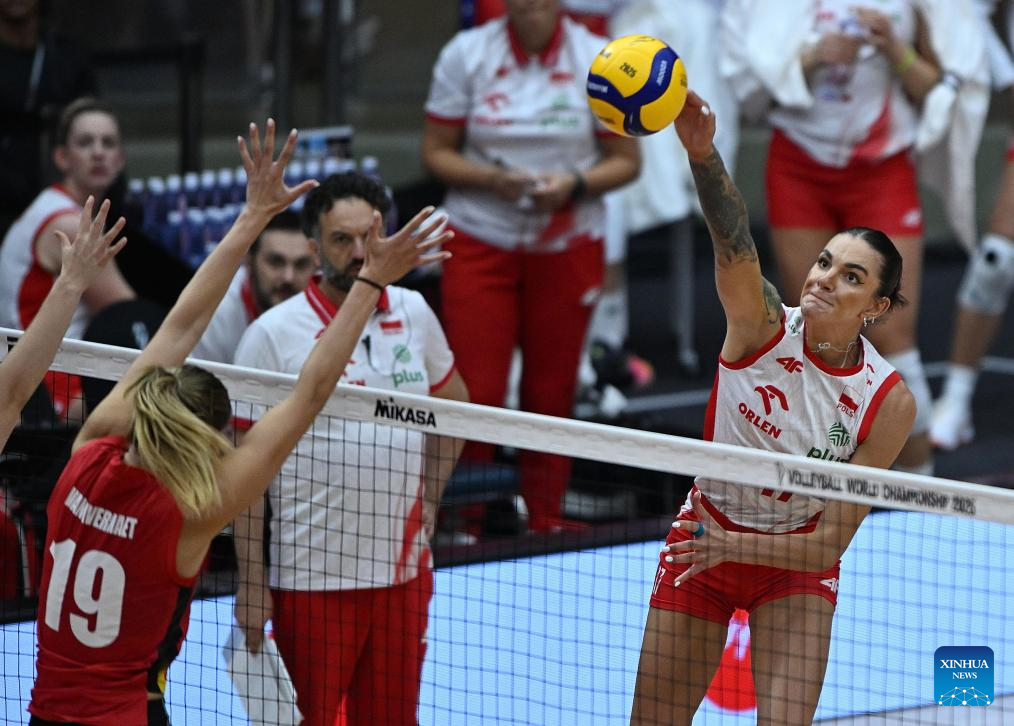 Martyna Lukasik (L) of Poland spikes the ball during the round of 16 match between Poland and Belgium at the Volleyball Women’s World Championship in Bangkok, Thailand, Aug. 30, 2025. (Xinhua/Hou Zhaokang)