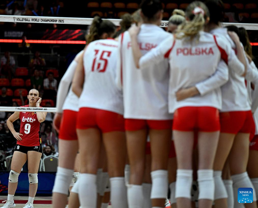Players of Poland celebrate scoring during the round of 16 match between Poland and Belgium at the Volleyball Women’s World Championship in Bangkok, Thailand, Aug. 30, 2025. (Xinhua/Hou Zhaokang)