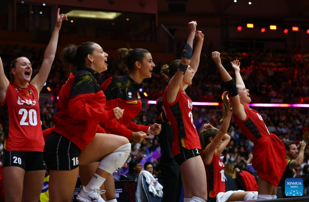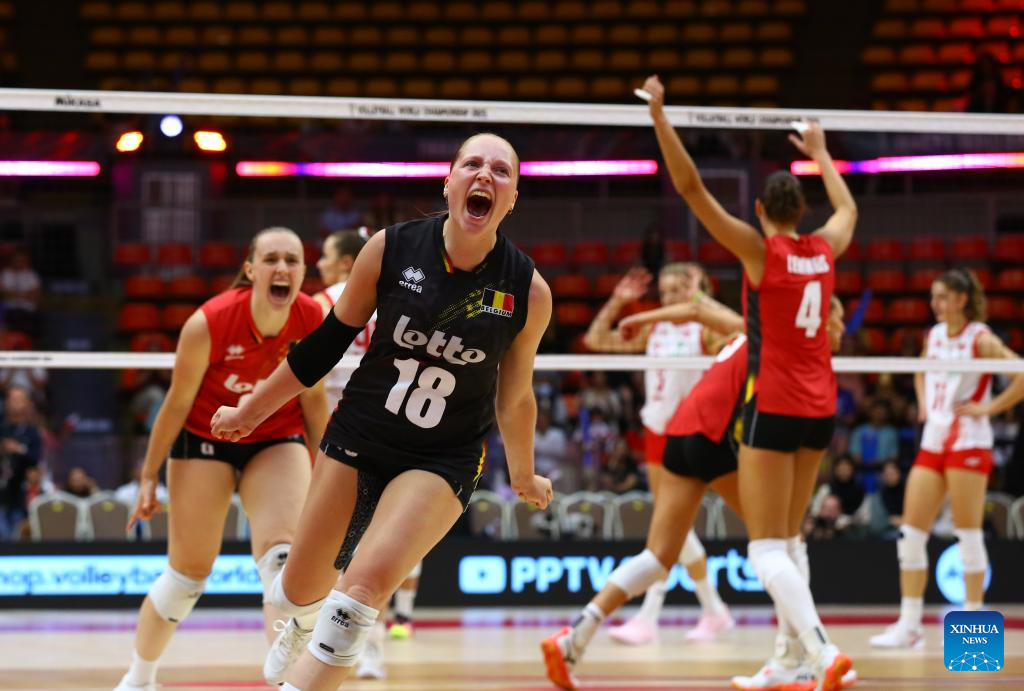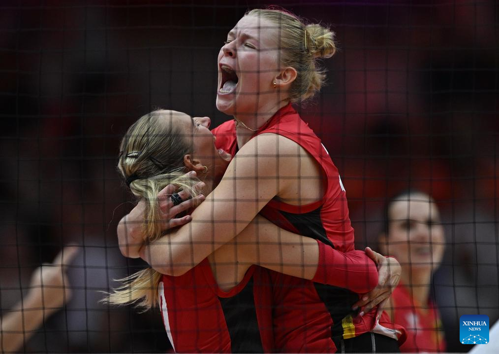 Players of Belgium celebrate scoring during the round of 16 match between Poland and Belgium at the Volleyball Women’s World Championship in Bangkok, Thailand, Aug. 30, 2025. (Xinhua/Sun Weitong)