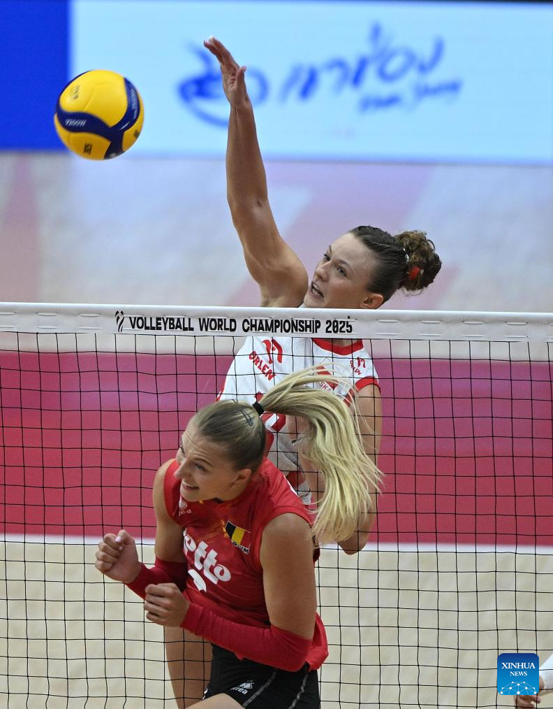 Britt Herbots (1st R) of Belgium competes during the round of 16 match between Poland and Belgium at the Volleyball Women’s World Championship in Bangkok, Thailand, Aug. 30, 2025. (Xinhua/Sun Weitong)