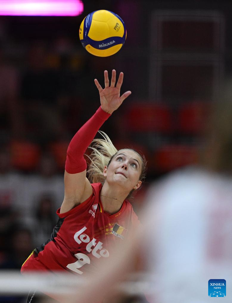 Elise Van Sas of Belgium serves during the round of 16 match between Poland and Belgium at the Volleyball Women’s World Championship in Bangkok, Thailand, Aug. 30, 2025. (Xinhua/Hou Zhaokang)