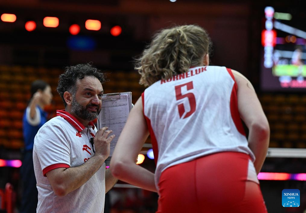 Stefano Lavarini (L), head coach of Poland instructs Agnieszka Korneluk during the round of 16 match between Poland and Belgium at the Volleyball Women’s World Championship in Bangkok, Thailand, Aug. 30, 2025. (Xinhua/Hou Zhaokang)