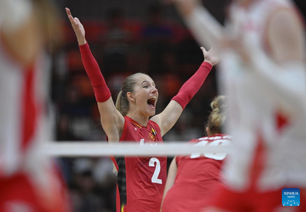 Britt Rampelberg of Belgium celebrates scoring during the round of 16 match between Poland and Belgium at the Volleyball Women’s World Championship in Bangkok, Thailand, Aug. 30, 2025. (Xinhua/Sun Weitong)