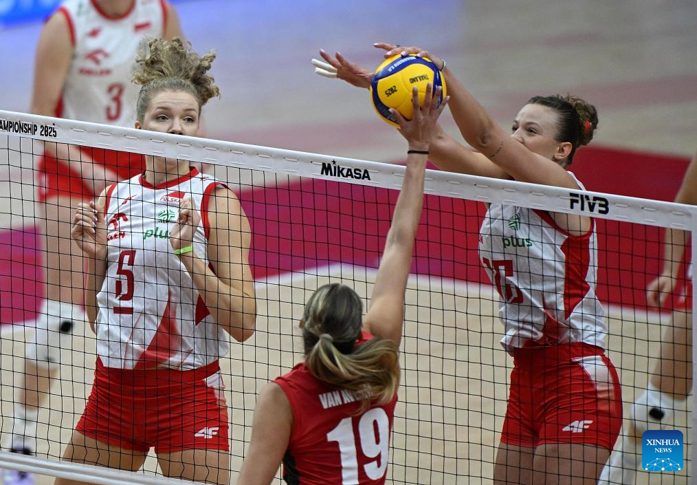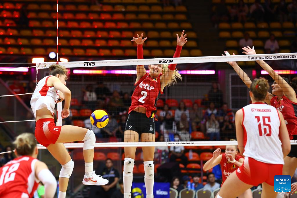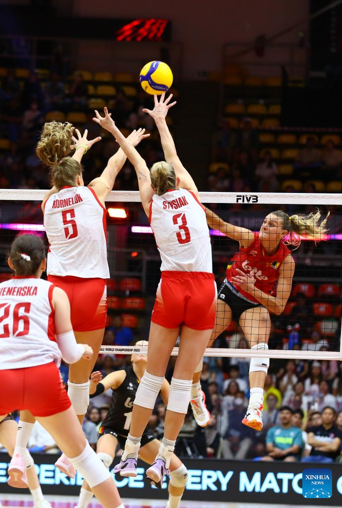 Martyna Czyrnianska (top R) of Poland competes against Silke Van Avermaet (C) of Belgium during the round of 16 match between Poland and Belgium at the Volleyball Women’s World Championship in Bangkok, Thailand, Aug. 30, 2025. (Xinhua/Hou Zhaokang)