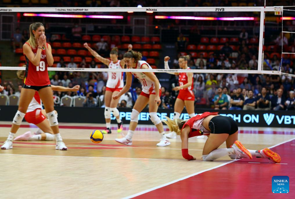 Players of Poland celebrate scoring during the round of 16 match between Poland and Belgium at the Volleyball Women’s World Championship in Bangkok, Thailand, Aug. 30, 2025. (Xinhua/Sun Weitong)
