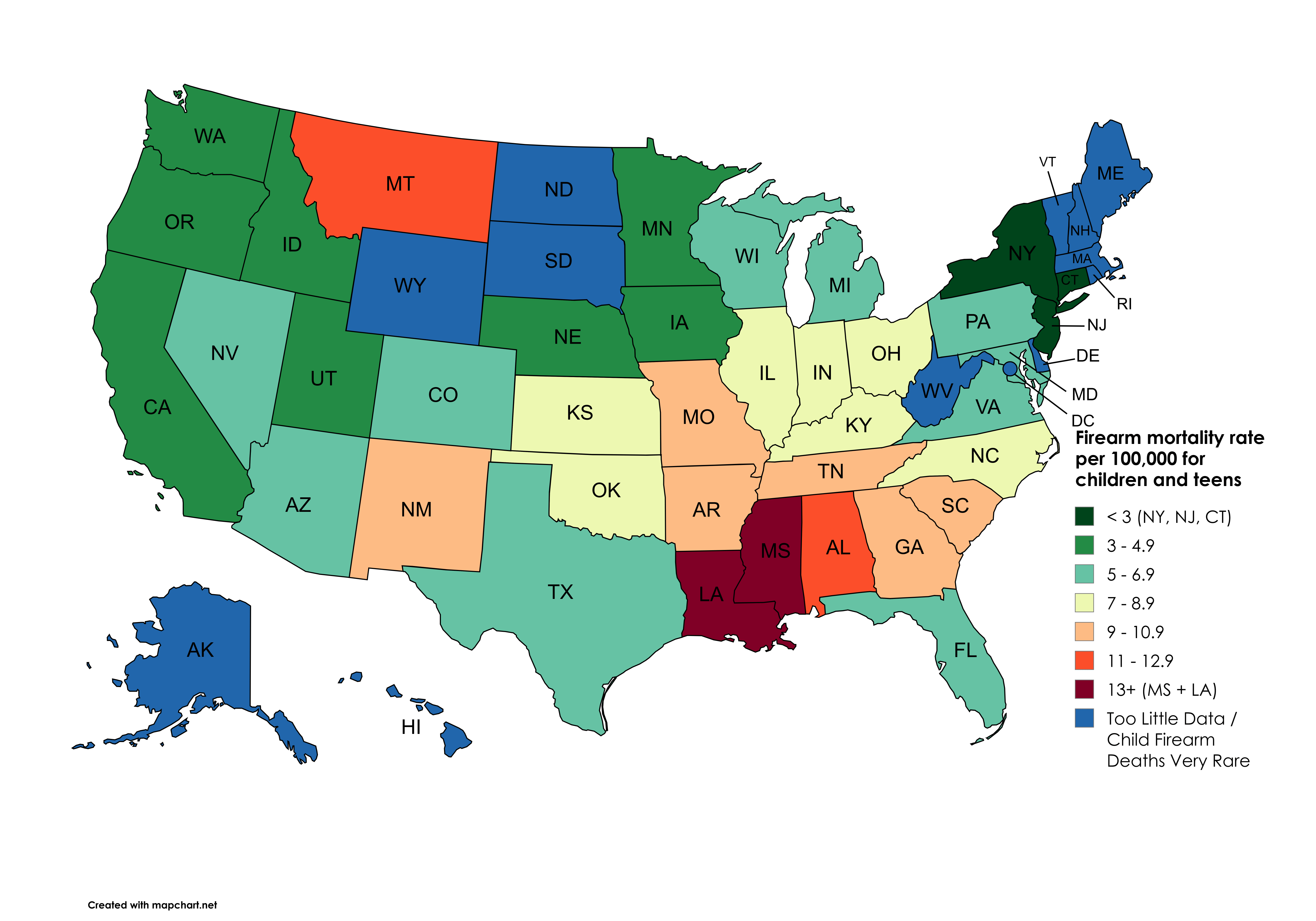 Data: CDC Wonder Injury Mechanism & All Other Leading Causes of Death data were used for the U.S. Rates for 12 states and D.C. are suppressed by the CDC because they had fewer than 20 firearm deaths among children ages 1-19 years.