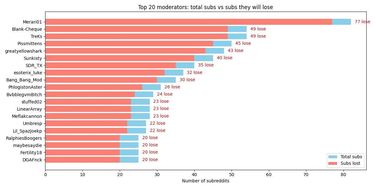 [OC] The top reddit powermods and how many subreddits they will be losing after the new rules come into place