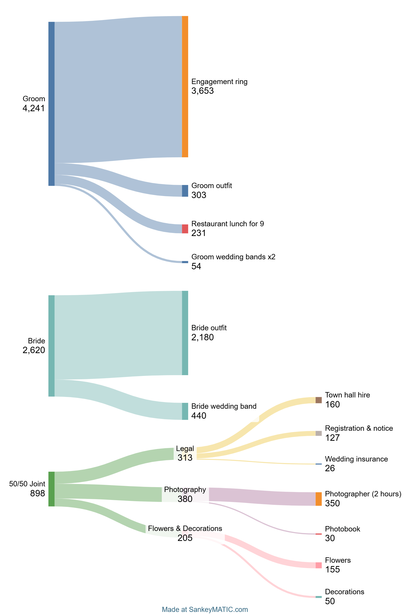 Last week's wedding Sankey made me curious about our own wedding costs during the 2020 pandemic, so I did and am posting it here for anyone interested in a small wedding for 9 people (including bride and groom). We had originally planned for it to be in May 2020 with about 40 people, but that was completely impossible, so we had to cancel the hen do and honeymoon, and postponed our wedding to August when lockdown was slightly lifted and they allowed a few guests.