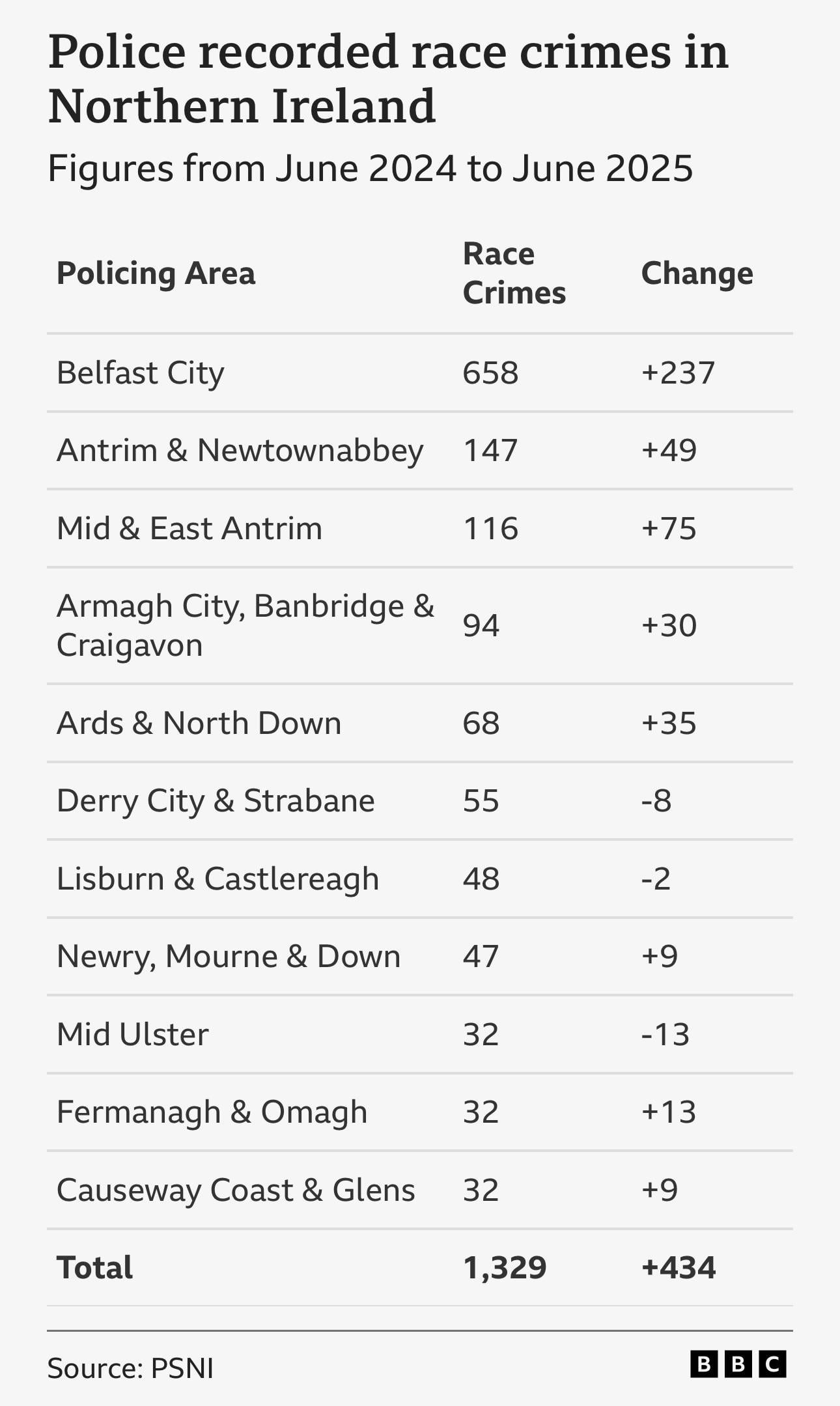 PSNI recorded race crimes in Northern Ireland