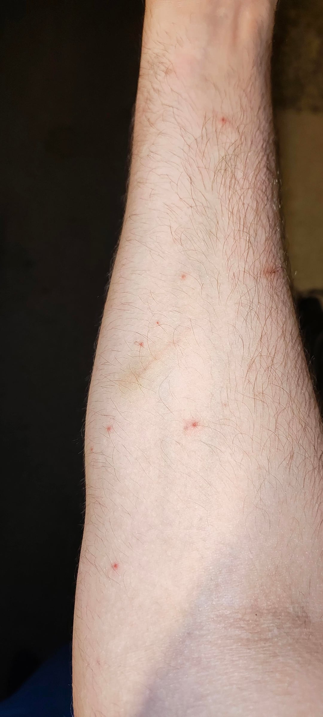 Kannst du näher ranzoomen an das Tier? Sieht mir auf den ersten Blick aus wie die Larve eines Teppichkäfers / Speckkäfers. Auch deine Stellen auf der Haut sehen nicht nach Bissen von Bettwanzen aus – die Haare der Teppichkäferlarven können bei einigen Menschen allergische Reaktionen auf der Haut auslösen, vielleicht ist es ja das.