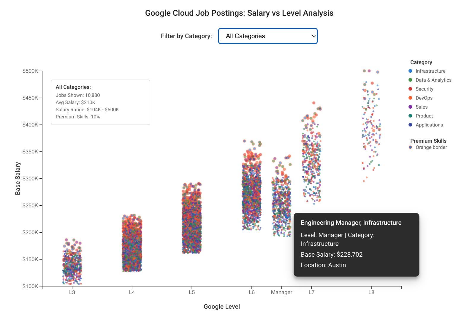 Google Cloud job postings from June-August 2025, extracted from BigQuery jobs database. Interactive scatter plot shows 10,880 individual data points with salary vs level distribution across 7 technology categories.