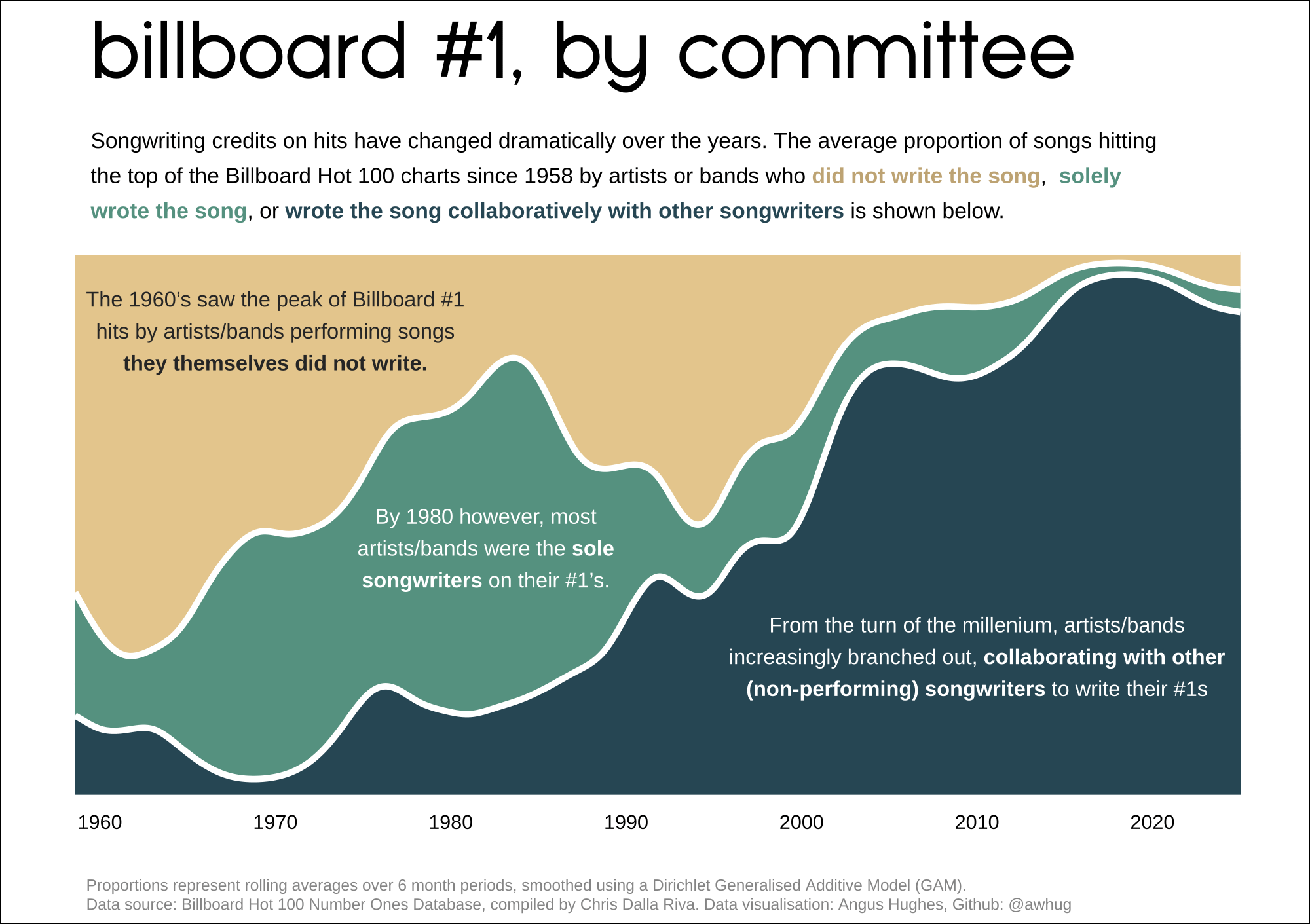The 1960s notably had many many hits by artists that also did not perform them on the records we know as classic songs. [The Wrecking Crew](https://en.wikipedia.org/wiki/The_Wrecking_Crew_(music)) is only one example of groups of studio performers on call. In the late 1980s, songwriting teams arose once again as it was much more profitable than performing. It has been argued, by people like Rick Beato, that performing artist writing credits on most of today’s hits are mere token/financial arrangements. So the graph is a bit misleading: the the dark green should be some shade of brown.