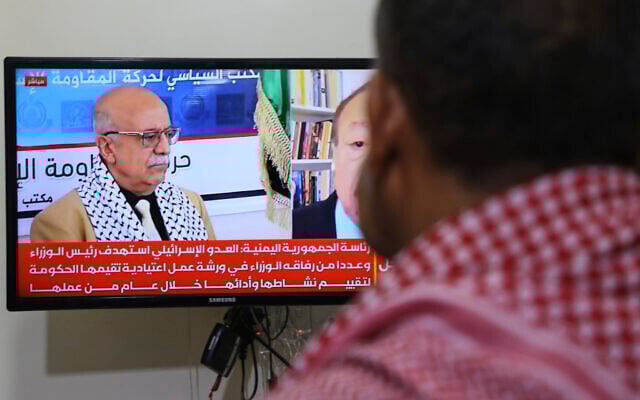 A man watches the news on TV, displaying footage of Ahmed al-Rahawi, the prime minister of the Houthi-controlled government, who was killed, along with others, on August 28, 2025, during Israeli strikes on the capital, in Sanaa, Yemen, August 30, 2025. (AP Photo/Osamah Abdulrahman)
