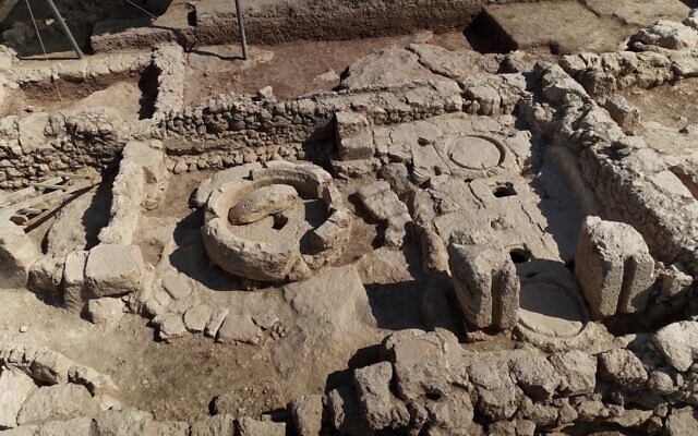 An olive press in a 4th-century Samaritan estate uncovered in Kafr Qasim, central Israel, during an excavation by the Israel Antiquities Authority, in a discovery announced on September 2, 2025. (Emil Aladjem/Israel Antiquities Authority)