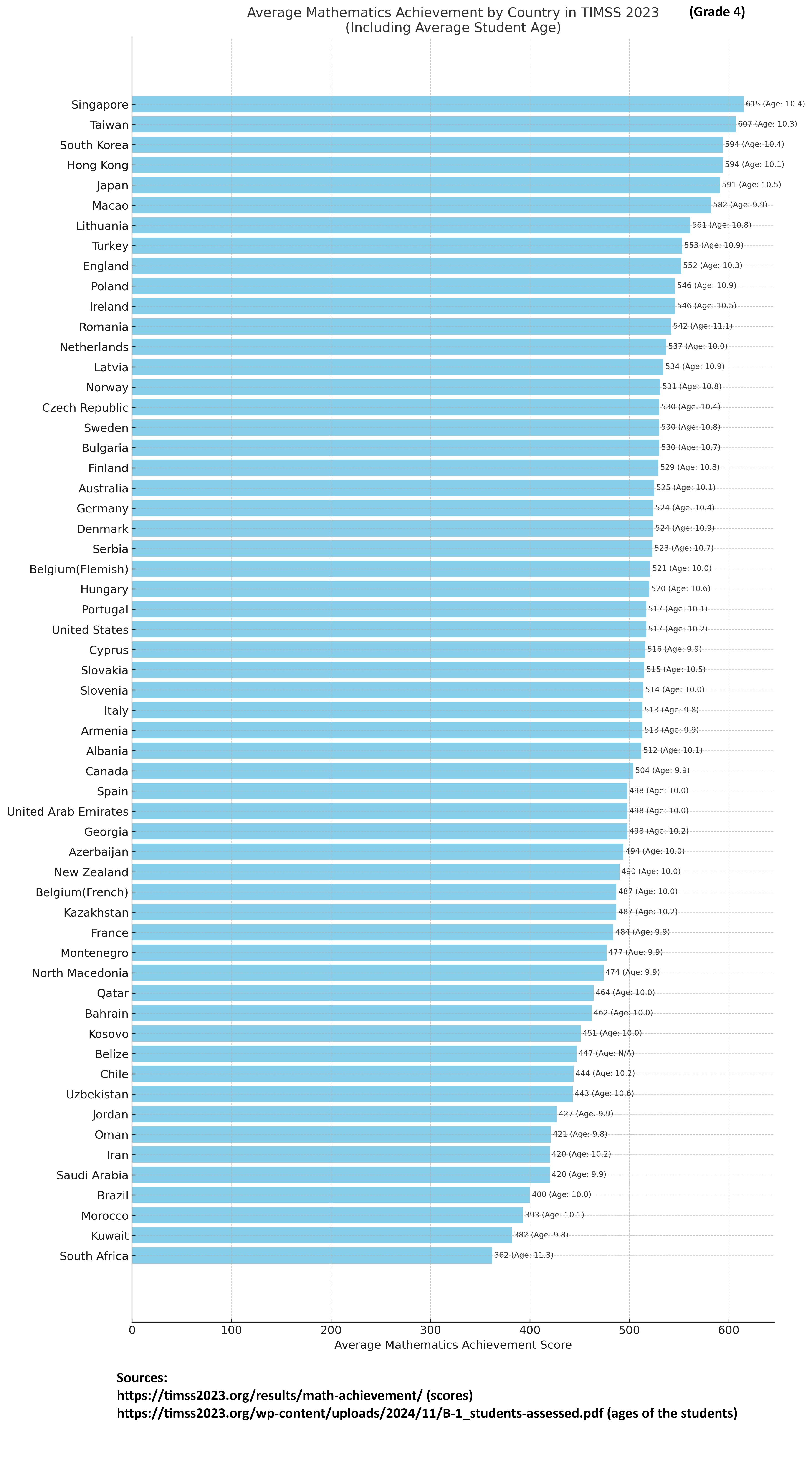 Sources: [https://timss2023.org/results/math-achievement/](https://timss2023.org/results/math-achievement/) (scores) [https://timss2023.org/wp-content/uploads/2024/11/8-1_students-assessed.pdf](https://timss2023.org/wp-content/uploads/2024/11/8-1_students-assessed.pdf) (ages of the students)