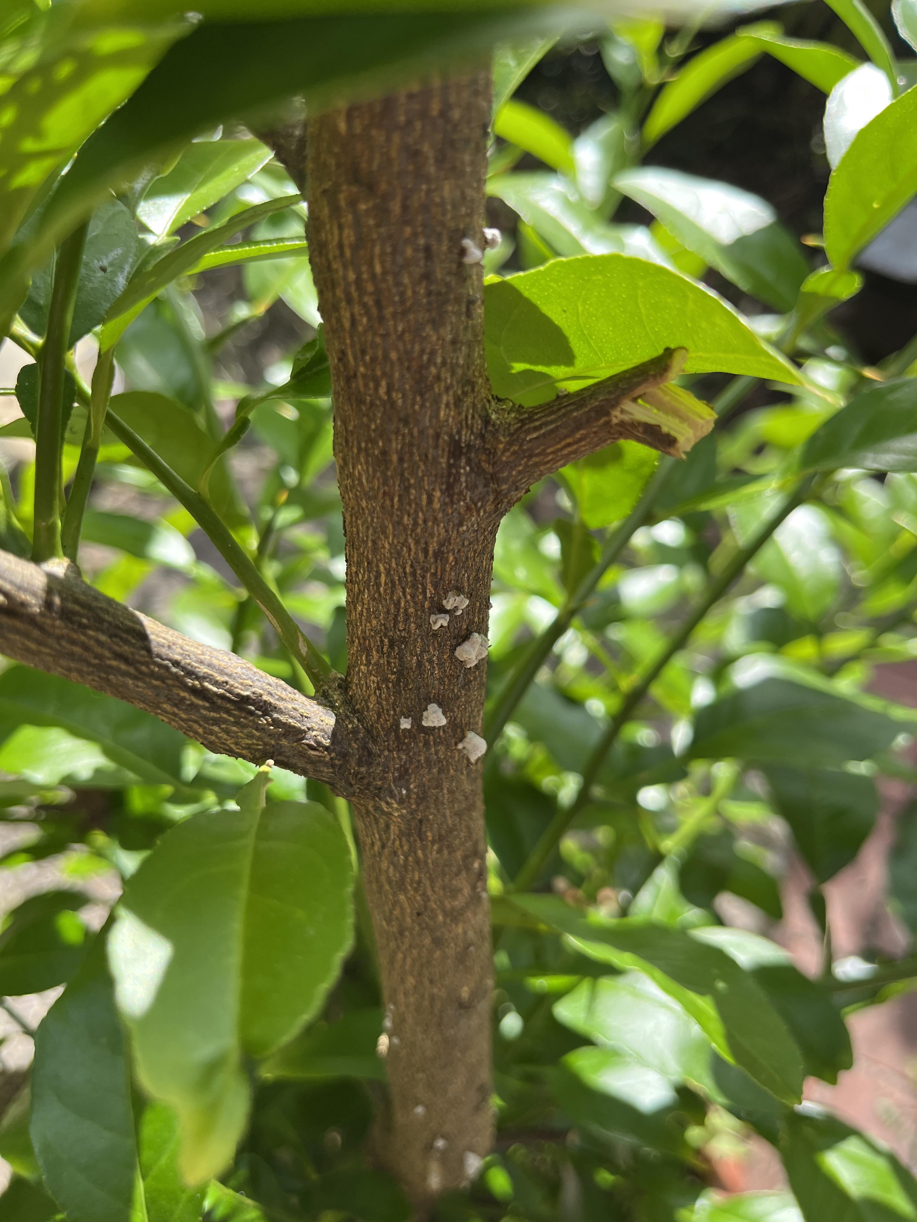 Seltsame Auswüchse auf einem Zitronenbaum. Schwiegermutter sagt, das seien Wollläuse, aber wir haben da so ein bisschen Zweifel, weil nirgendwo Läuse sitzen und beim Abziehen auch ein Stück Rinde mit abgeht. Was könnte das sonst sein?